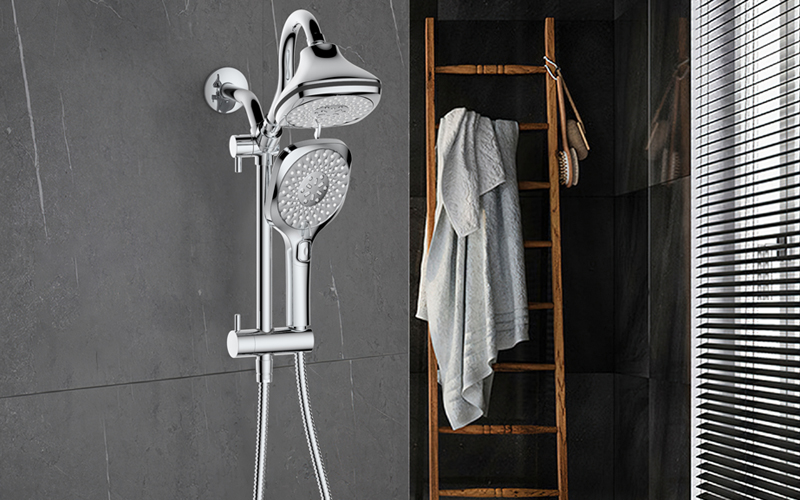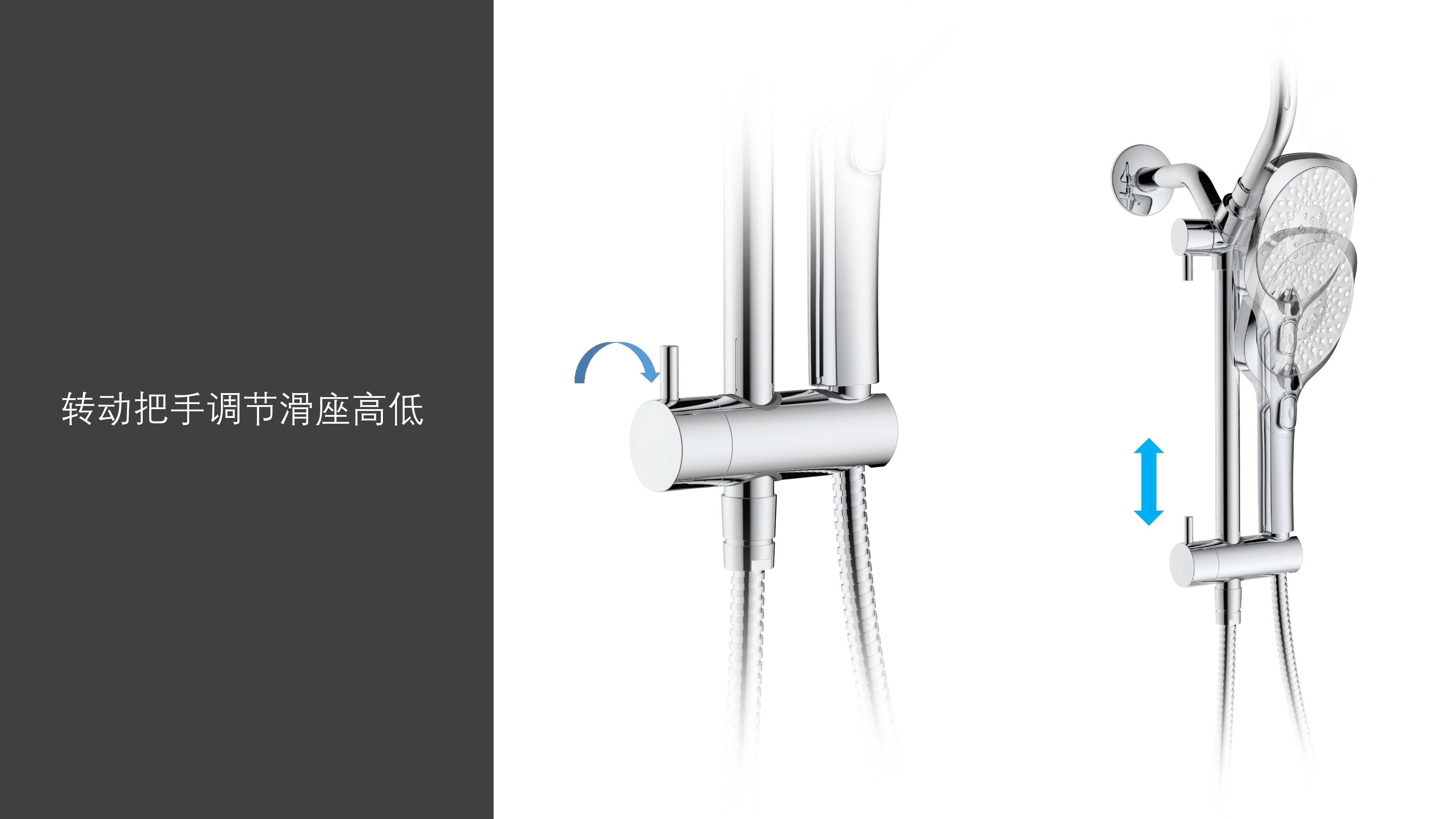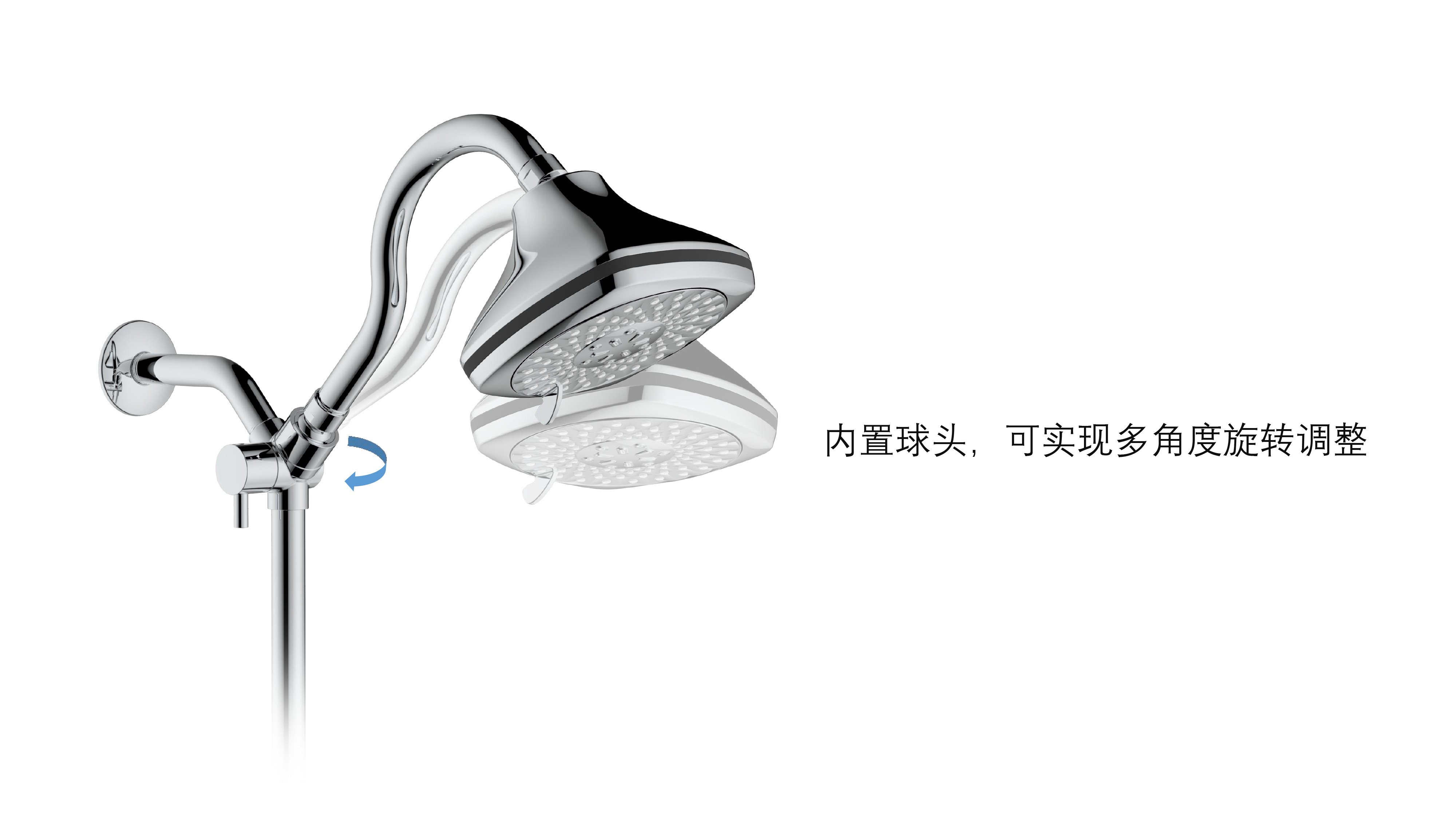 上出水彎管套裝;頂噴內置球頭,可實現多角度旋轉調整;把手切換頂噴出水、花灑出水;轉動把手調節(jié)滑座高低;8功能出水花灑